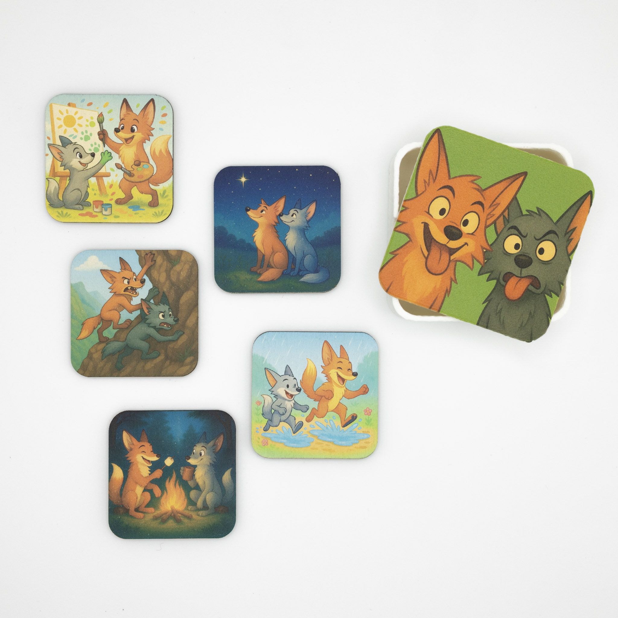 Twee vrolijke vosjes beleven samen allerlei avonturen. Van schilderen in de zon tot springen door regenplassen, marshmallows roosteren en sterren kijken. Waar ze ook zijn, hun vriendschap en vrolijke streken brengen kleur in elke nieuwe dag.