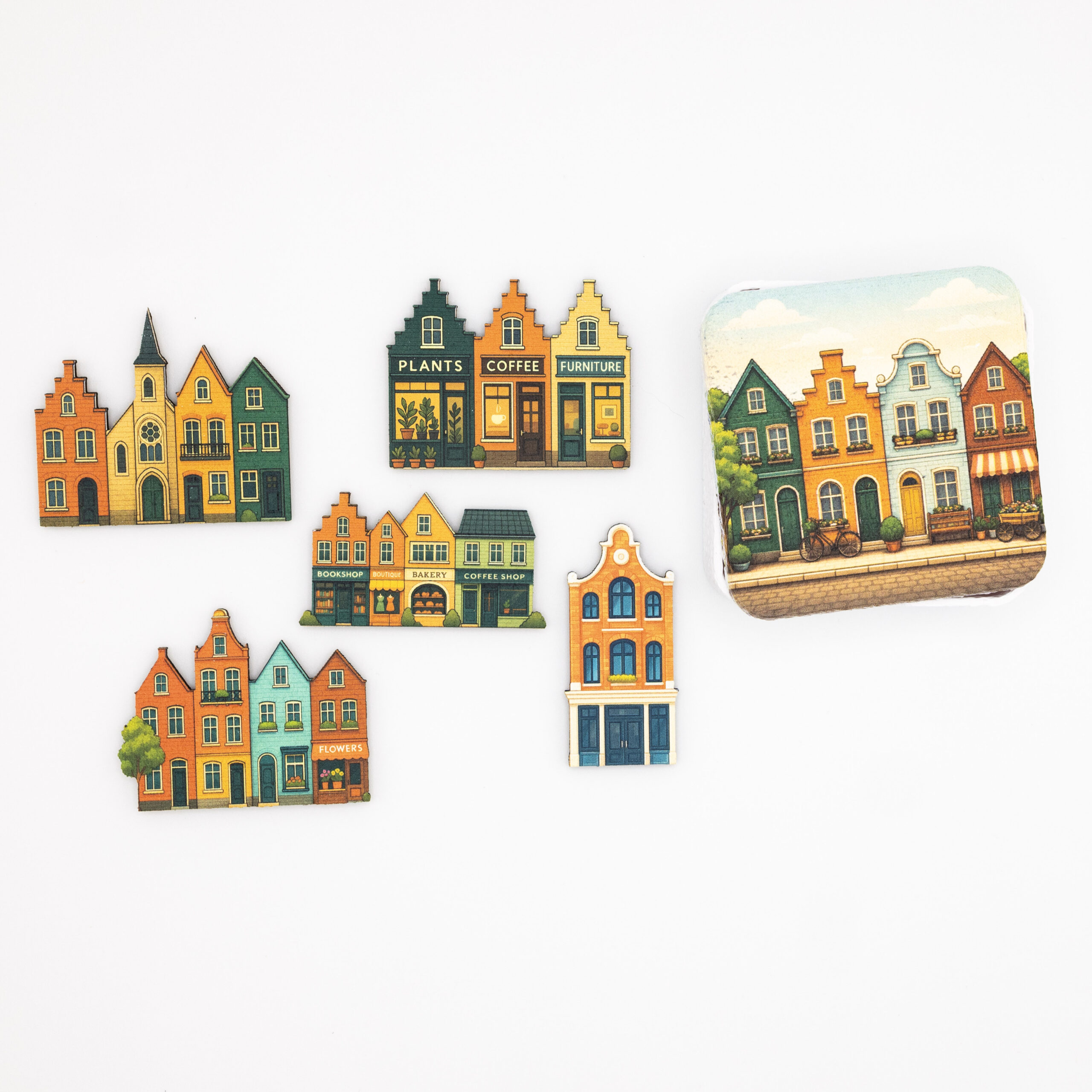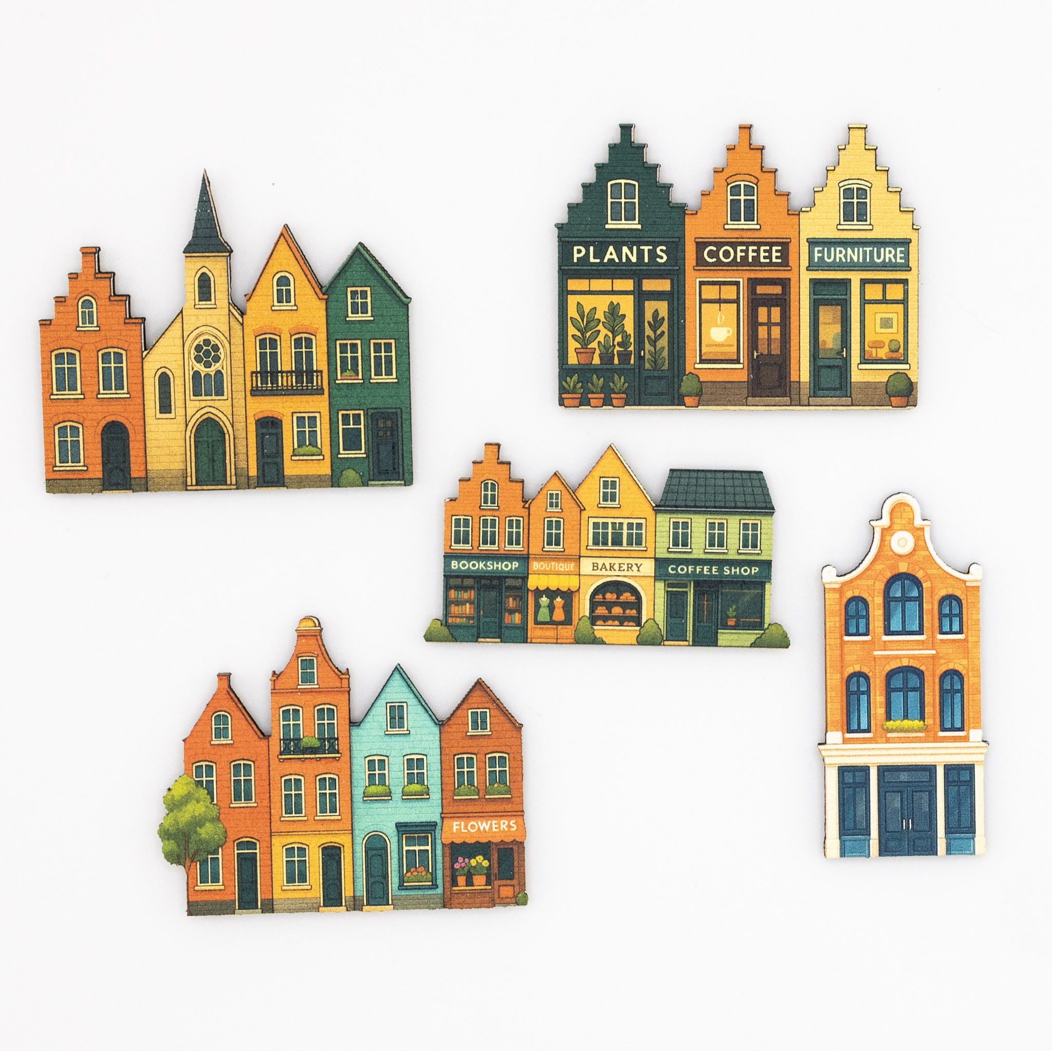 Een vrolijk rij kleurrijke huisjes en winkeltjes brengt de straat tot leven. Tussen bloemen, boeken en koffie hangt een warme, gezellige sfeer.